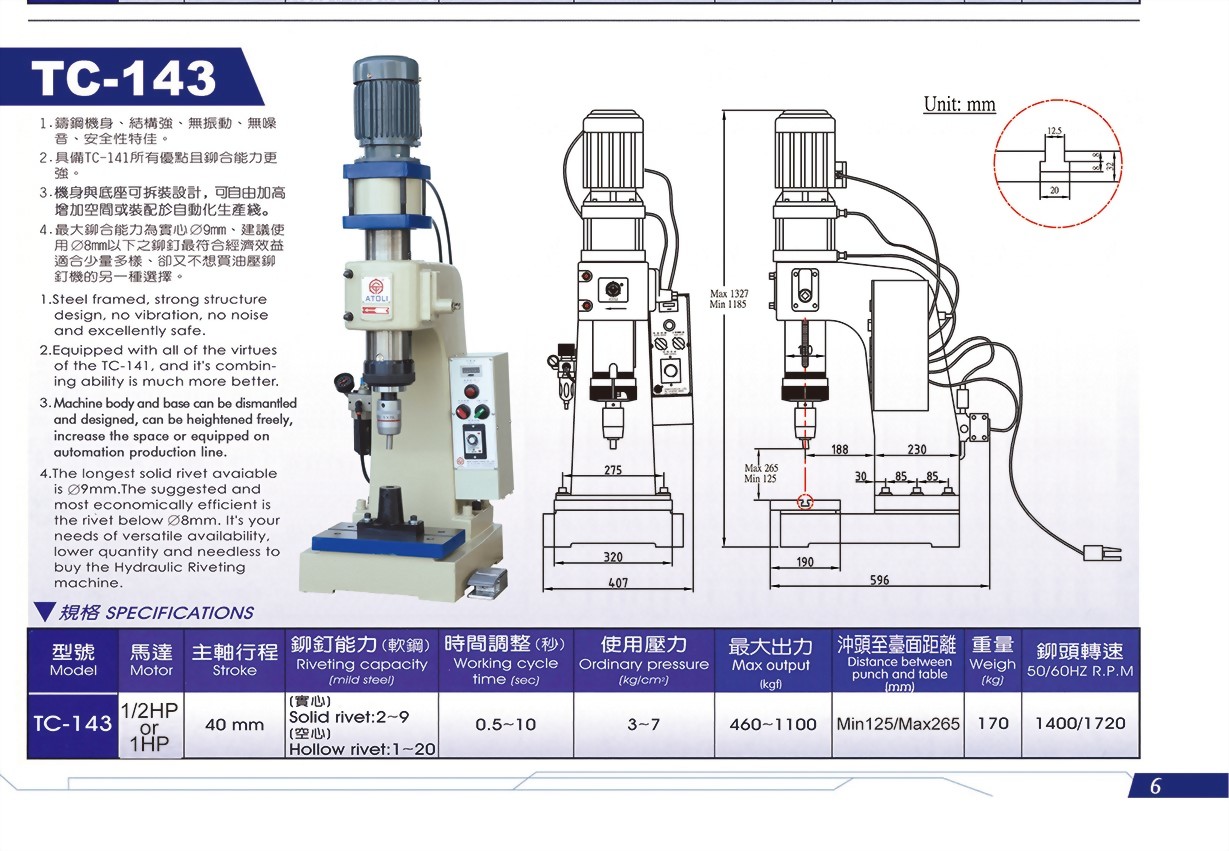 鑄鋼機身,結構強、無震動、無噪音、安全性特佳。 具備TC-141所有優點且鉚合能力更強。 配合客戶所要求之使用電壓。 最大鉚合能力為實心ψ9mm、建議使用ψ8mm以下之鉚釘最符合經濟效益適合少量多樣、卻又不想買油壓鉚釘機的另一種選擇。 |